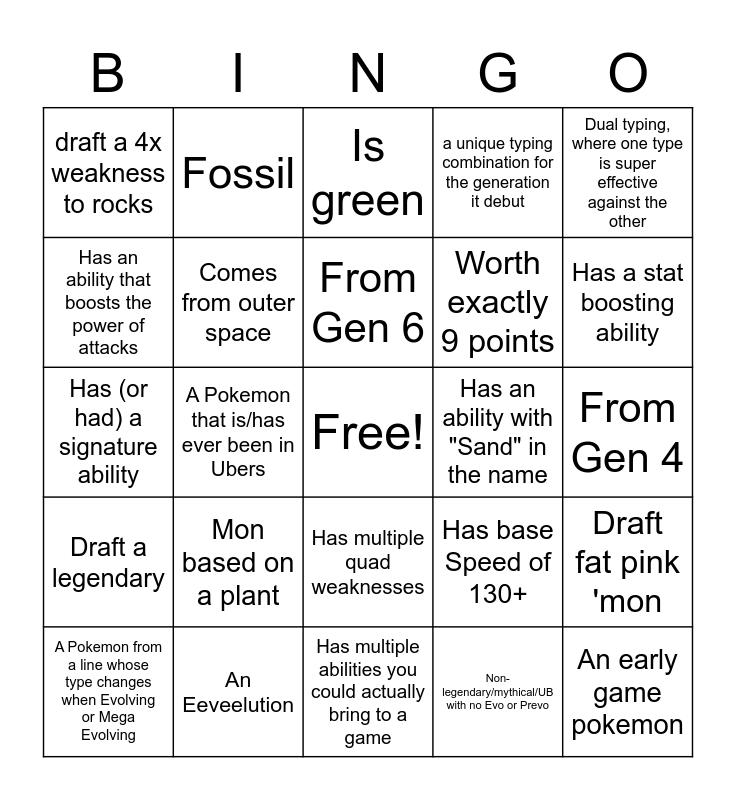 This bingo card has a free space and 90 words: Has multiple immunities (fighting+normal doesn't count) (includes abilities), Has no quad weaknesses (must be a dual-type mon), Has multiple quad weaknesses, Has exactly 600 BST, Is NFE, Has (or had) a signature move, Has a signature item, A Starter (non-Mega), Has a base stat of over 150, A weather or terrain setter, From Gen 1, From Gen 2, From Gen 3, From Gen 4, From Gen 5, From Gen 6, From Gen 7, Total BST < 450, cannot also count as NFE, Has a Gigantamax form, Has a Mega form (base form), Has only 1 ability (non-Mega), Has alternative form(s), Has multiple abilities you could actually bring to a game, Has a trapping ability or move, Has (or had) a signature ability, An Eeveelution, Has an Evo or Prevo released in a different generation, Has Intimidate, A hazard remover that resists rocks, Weighs over 500 lbs, Weighs under 5 lbs, Draft fat pink 'mon, Draft mon worth 18 points or more, Draft a legendary, draft a 4x weakness to rocks, a unique typing combination for the generation it debut, Is green, From Gen 8, A Pokemon that is/has ever been in Ubers, Has a stat boosting ability, A Pokemon from a line whose type changes when Evolving or Mega Evolving, Has an ability that boosts the power of attacks, Learns a dancing move, Has access to an ability that is negative or useless in singles, Has equal Attack and Special Attack stats, Has base Speed of 130+, A Pokemon where the Mega is worth 7+ points more than its base form (can draft base or mega), Worth exactly 5 points, Worth exactly 6 points, Worth exactly 7 points, Worth exactly 8 points, Worth exactly 9 points, Worth exactly 10 points, Worth exactly 11 points, Learns an OHKO move, Learns a signature Z-move, Has an ability with "Sand" in the name, Has had its typing changed since its release, Has only one type, Learns multiple pivoting moves, Worth exactly 12 points, Worth exactly 4 points, Worth exactly 3 points, Worth exactly 2 points, Worth exactly 1 point, Worth exactly 13 points, Mon (or its prevo/evo) has an emote in IBL, Non-legendary/mythical/UB with no Evo or Prevo, A monkey, Mon in someone's team name, Mon based on a plant, An early game pokemon, A route 1 bird, Both a hazard setter and remover, Fossil, Comes from outer space, Route 1 bug, Poketuber Mascot, Has Defog, Has sleep move, Has rapid spin, Dual typing, where one type is super effective against the other, Dual typing, where one type resists the other, Contriubtes to two standard cores (fwg, fds, fdp), A pokemon or evo used by an evil organization, A pokemon based on a domesticated animal, A pokemon or its evo that can be received through NPC trades, A mon you want to give a hug to, Drafted to the same team for consecutive seasons and Used by a pokemon league champion (besides yourself, champ ;)).