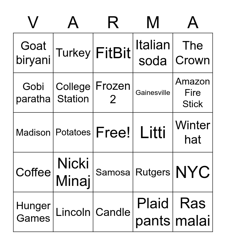 This bingo card has a free space and 24 words: Nicki Minaj, Lincoln, Frozen 2, Hunger Games, The Crown, Goat biryani, Gobi paratha, Turkey, Litti, Samosa, Gainesville, Madison, Rutgers, NYC, College Station, Plaid pants, Winter hat, FitBit, Amazon Fire Stick, Potatoes, Ras malai, Coffee, Italian soda and Candle.