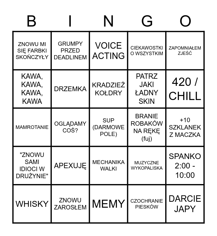 This bingo card has a free space and 24 words: APEXUJĘ, ZNOWU ZAROSŁEM, KRADZIEŻ KOŁDRY, WHISKY, ZAPOMNIAŁEM ZJEŚĆ, ZNOWU MI SIĘ FARBKI SKOŃCZYŁY, KAWA, KAWA, KAWA, KAWA, GRUMPY PRZED DEADLINEM, BRANIE ROBAKÓW NA RĘKĘ (fuj), MECHANIKA WALKI, PATRZ JAKI ŁADNY SKIN, MAMROTANIE, MUZYCZNE WYKOPALISKA, SPANKO 2:00 - 10:00, DRZEMKA, CZOCHRANIE PIESKÓW, +10 SZKLANEK Z MACZKA, VOICE ACTING, 420 / CHILL, OGLĄDAMY COŚ?, DARCIE JAPY, "ZNOWU SAMI IDIOCI W DRUŻYNIE", CIEKAWOSTKI O WSZYSTKIM and MEMY.