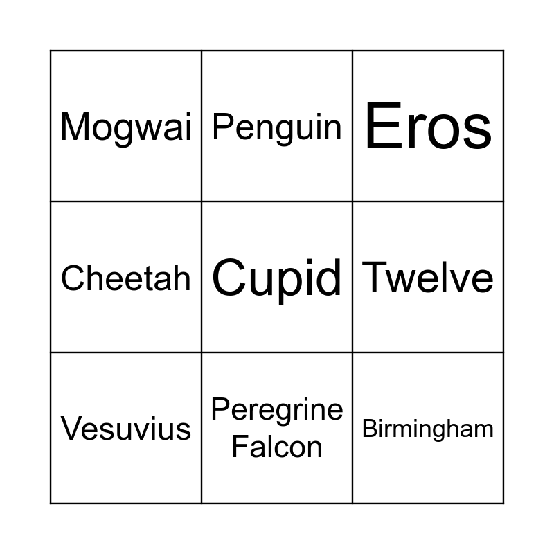 This bingo card has 18 words: Vesuvius, Harry Kane, Eros, Mogwai, Peregrine Falcon, Twelve, Edinburgh, Penguin, Gold, Cheetah, Owl, Birmingham, Diamond, Cupid, Philippe Coutinho, Silver, Five and Eight.