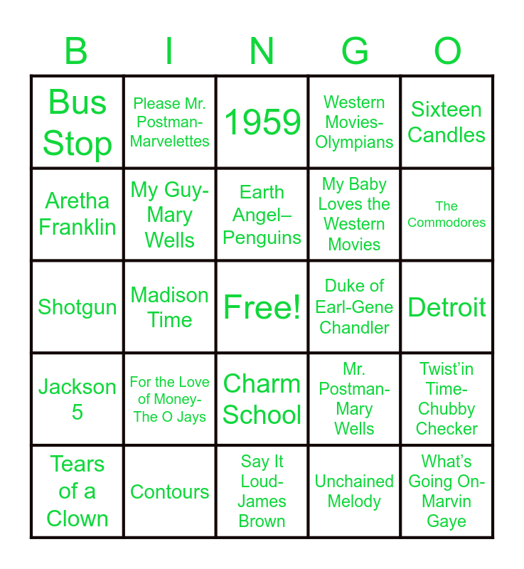 This bingo card has a free space and 50 words: Diana Ross, What’s Going On-Marvin Gaye, My Girl-Temptations, Say It Loud-James Brown, For the Love of Money-The O Jays, Stop in the Name of Love-Supremes, Please Mr. Postman-Marvelettes, Baby Love-Supremes, Aretha Franklin, Pusherman-Curtis Mayfield, My Guy-Mary Wells, Western Movies-Olympians, Twist’in Time- Chubby Checker, Mr. Postman- Mary Wells, The Thrill Is Gone-Bobby Blue Bland, Respect, Earth Angel–Penguins, Duke of Earl-Gene Chandler, Lonely Heartache-Jacky Wilson, Sixteen Candles, Madison Time, Unchained Melody, Bus Stop, My Baby Loves the Western Movies, It Won’t Be Long-Tina Turner, Motor City, The Commodores, Martha Reeves, 1959, Charm School, Otis Redding, Jimmy Mack, Heatwave, Suzanne DePasse, Contours, Get Ready, Martha & The Vandellas, Martha Reeves, Hitsville, Detroit, The Watusi, The Swim, The Four Tops, Jimmy Ruffin, Tears of a Clown, Shotgun, Just My Imagination, The Velvelettes, Jackson 5 and Papa was a Rollin’ Stone.