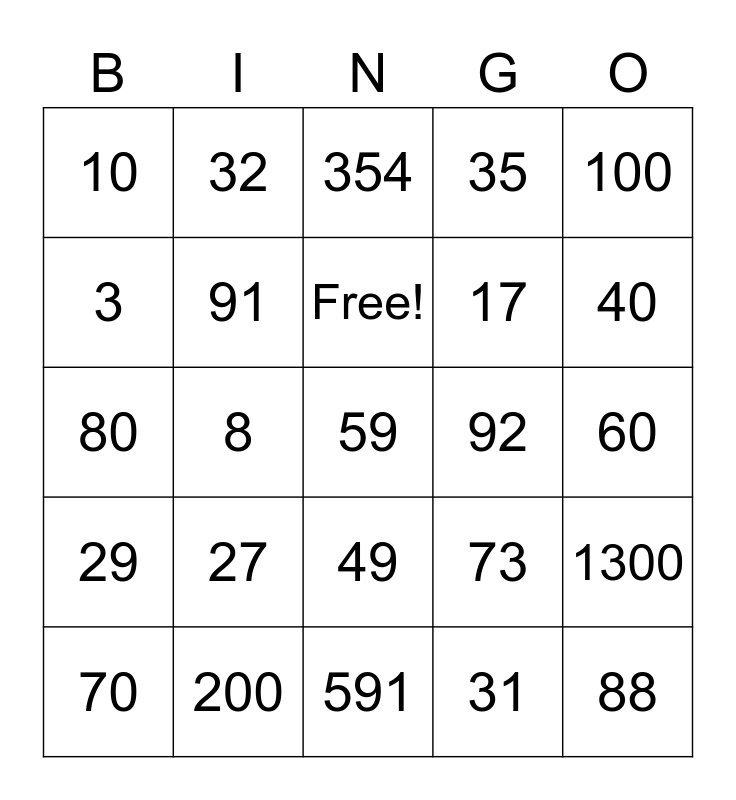 This bingo card has 67 words: 14, 58, 342, 1300, 21, 77, 32, 83, Free!, 2480, 49, 96, 60, 100, 5761, 3, 8, 10, 24, 17, 27, 29, 35, 31, 33, 37, 47, 48, 40, 54, 59, 53, 67, 62, 66, 70, 78, 73, 80, 88, 85, 91, 92, 101, 167, 160, 174, 200, 280, 350, 354, 398, 420, 427, 590, 591, 777, 910, 1000, 1500, 1515, 1900, 2400, 2450, 2433, 3200 and 10000.