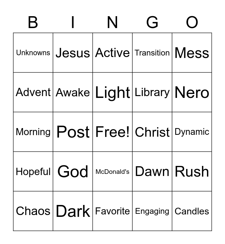 This bingo card has a free space and 24 words: God, Dark, Light, Chaos, Mess, Unknowns, Advent, Jesus, Christ, McDonald's, Library, Morning, Dawn, Rush, Awake, Engaging, Dynamic, Active, Nero, Post, Candles, Hopeful, Transition and Favorite.