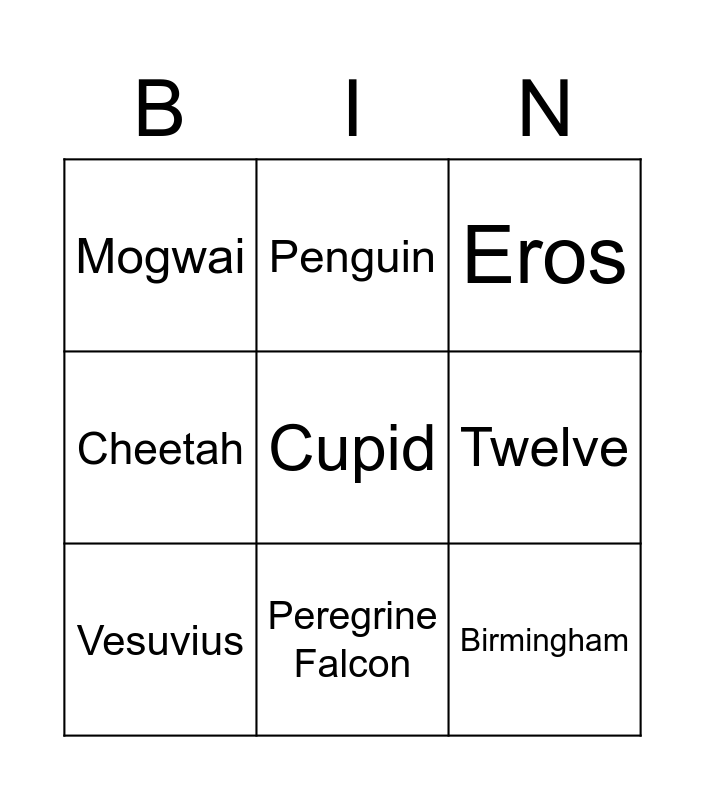 This bingo card has 18 words: Vesuvius, Harry Kane, Eros, Mogwai, Peregrine Falcon, Twelve, Edinburgh, Penguin, Gold, Cheetah, Owl, Birmingham, Diamond, Cupid, Philippe Coutinho, Silver, Five and Eight.