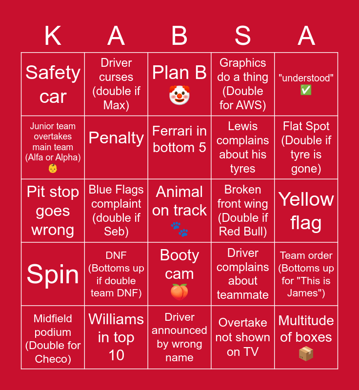 This bingo card has 25 words: DNF (Bottoms up if double team DNF), Driver announced by wrong name, Ferrari in bottom 5, Midfield podium (Double for Checo), "understood" ✅, Safety car, Junior team overtakes main team (Alfa or Alpha) 👶, Driver curses (double if Max), Broken front wing (Double if Red Bull), Booty cam 🍑, Lewis complains about his tyres, Pit stop goes wrong, Driver complains about teammate, Team order (Bottoms up for "This is James"), Penalty, Multitude of boxes 📦, Yellow flag, Plan B 🤡, Flat Spot (Double if tyre is gone), Blue Flags complaint (double if Seb), Animal on track 🐾, Williams in top 10, Spin, Graphics do a thing (Double for AWS) and Overtake not shown on TV.
