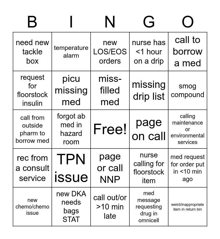 This bingo card has a free space and 46 words: missing lipid/adjust lipid time, weird/inappropriate item in return bin, compatibility question, call out/or >10 min late, TPN issue, stat alteplase, temperature alarm, missing insulin syringe, request for floorstock insulin, code response needed, picu missing med, nurse has <1 hour on a drip, med request for order put in <10 min ago, nurse calling for floorstock item, fast mover out of stock, tube station down, miss-filled med, page on call, retail (break-in, counseling, nurse calling wrong #), call to borrow a med, forgot ab med in hazard room, med message requesting drug in omnicell, need new tackle box, missing drip list, expired compound, smog compound, new chemo/chemo issue, premix station with >5 to prep, page or call NNP, rec from a consult service, someone forgot PIN for tube, omnicell out of stock (call or message from nurse), med not scanning, trauma B/stab code, expired med (not compound), new DKA needs bags STAT, calling maintenance or environmental services, pharm-is ticket, doseedge bypass, unique name, brand new TPN, new LOS/EOS orders, call from outside pharm to borrow med, tube doorbell for full tube, verify home med and incorrect range order.