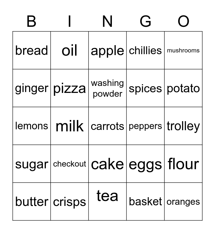 This bingo card has a free space and 31 words: tea, coffee, milk, tomato, bread, apple, pizza, eggs, peppers, basket, trolley, oranges, cheese, ketchup, potato, chips, flour, checkout, sugar, cake, mushrooms, onions, butter, oil, spices, ginger, chillies, lemons, crisps, washing powder and salt.