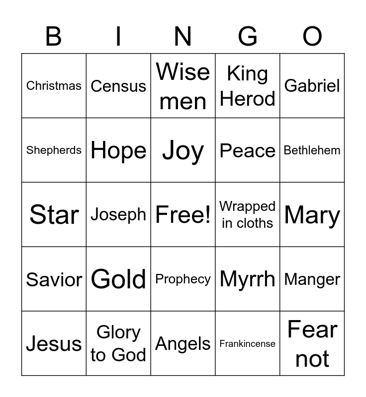 This bingo card has a free space and 24 words: Jesus, Gold, Joy, Frankincense, Gabriel, Christmas, Census, Wise men, Wrapped in cloths, Mary, Star, Hope, Myrrh, Manger, Shepherds, Glory to God, Angels, King Herod, Bethlehem, Savior, Joseph, Prophecy, Peace and Fear not.