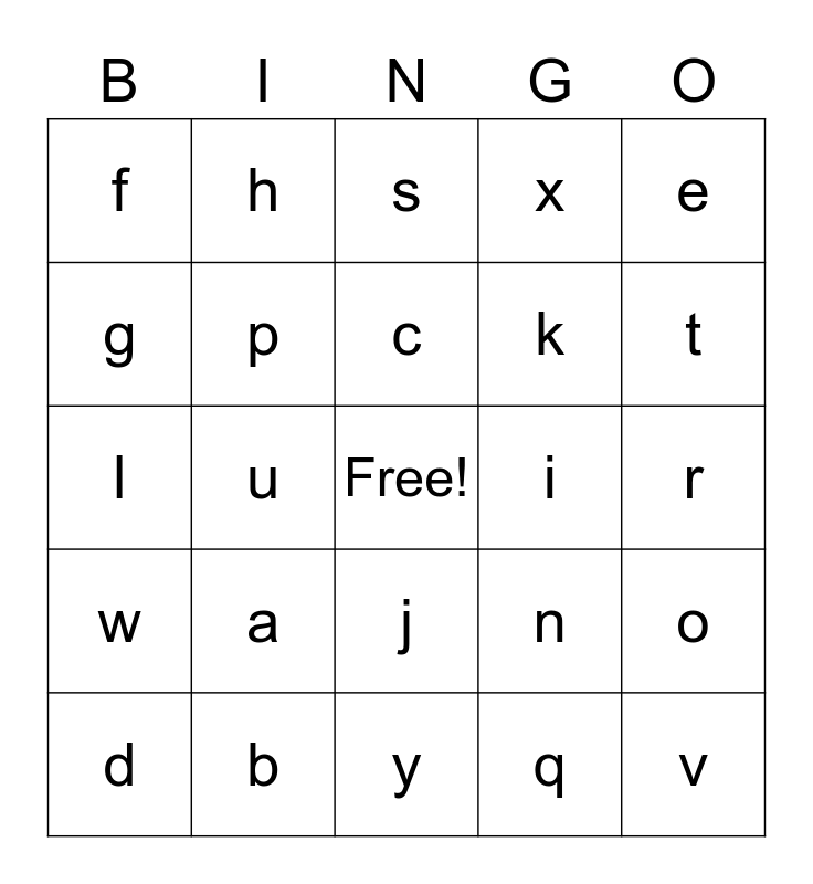 This bingo card has a free space and 24 words: a, b, c, d, e, f, g, h, i, j, k, l, n, o, p, q, r, s, t, u, v, w, x and y.