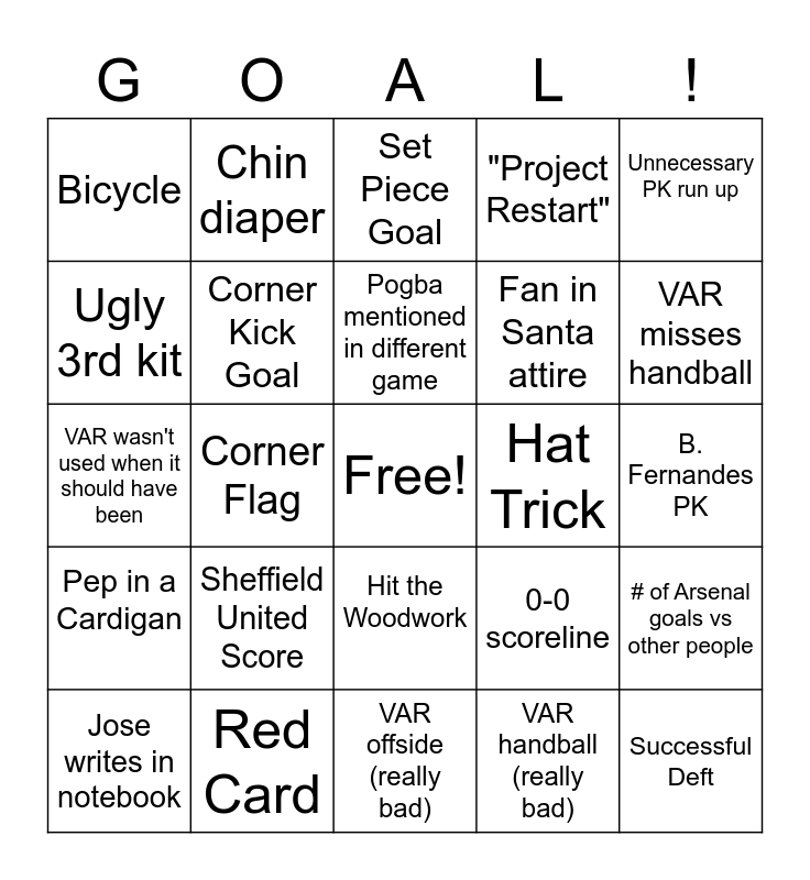 This bingo card has a free space and 29 words: Jose writes in notebook, Kloopelganger, Corner Flag, Diving Header, Bicycle, Set Piece Goal, Corner Kick Goal, Sheffield United Score, Hat Trick, Red Card, B. Fernandes PK, Successful Deft, VAR offside (really bad), VAR handball (really bad), VAR misses handball, Own Goal, Hit the Woodwork, Pep in a Cardigan, Unnecessary PK run up, VAR wasn't used when it should have been, 0-0 scoreline, Game with 5+ goals, Fan in Santa attire, Ugly 3rd kit, "Project Restart", Chin diaper, # of Arsenal goals vs other people, Pogba mentioned in different game and Trade rumors.