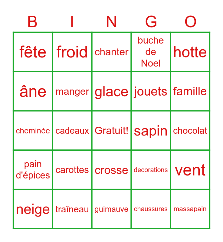 This bingo card has a free space and 29 words: neige, St. Nicolas, cadeaux, enfants, fête, chanter, manger, carottes, sapin, traîneau, chocolat, massapain, guimauve, chaussures, famille, mitre, crosse, pain d'épices, hotte, cheminée, decorations, bonbons, jouets, âne, buche de Noel, froid, vent, glace and amusement.
