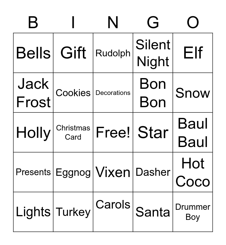 This bingo card has a free space and 34 words: Christmas, Santa, Sleigh, Tree, Presents, Cookies, Elf, Lights, Gift, Mistletoe, Decorations, Rudolph, Candy Cane, Wreath, Star, Snow, Turkey, Holly, Eggnog, Dasher, Vixen, Tinsel, Bells, Baul Baul, Carols, Drummer Boy, Silent Night, Jingle Bells, Bon Bon, Jack Frost, Gingerbread, Christmas Card, Hot Coco and Frosting.
