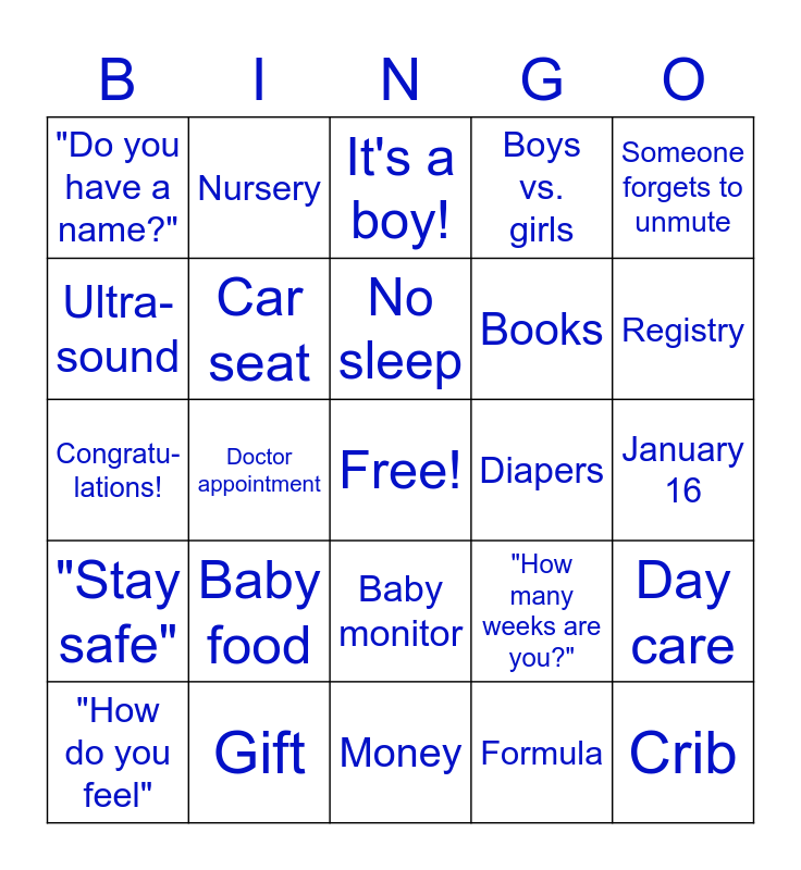 This bingo card has a free space and 24 words: Baby food, Gift, No sleep, "How do you feel", Someone forgets to unmute, "Do you have a name?", Ultra-sound, Nursery, Diapers, Baby monitor, Books, Congratu-lations!, "How many weeks are you?", Day care, Car seat, Formula, January 16, It's a boy!, Registry, Doctor appointment, Crib, "Stay safe", Boys vs. girls and Money.