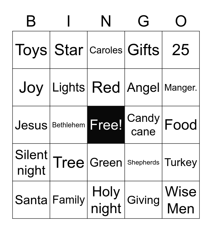 This bingo card has a free space and 24 words: Santa, Tree, Red, Giving, 25, Toys, Star, Caroles, Candy cane, Food, Jesus, Lights, Shepherds, Turkey, Joy, Family, Holy night, Gifts, Manger., Silent night, Bethlehem, Green, Angel and Wise Men.