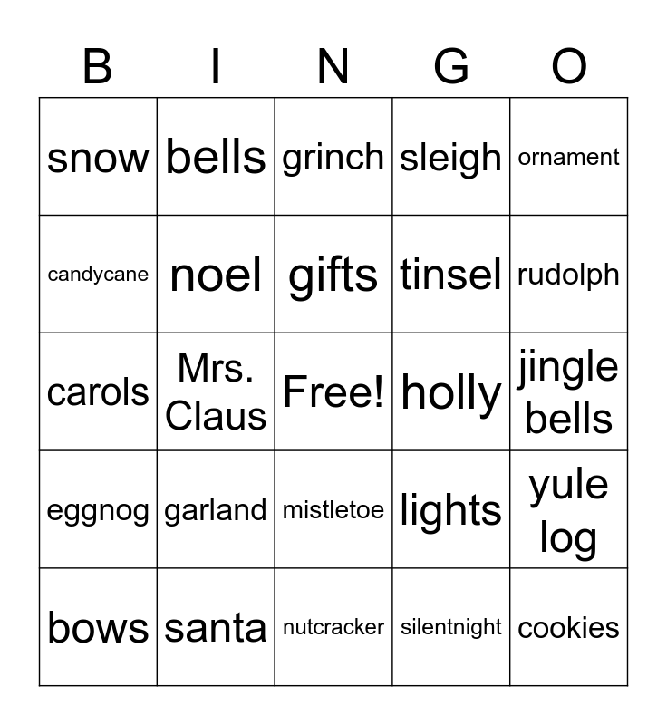 This bingo card has a free space and 24 words: garland, santa, gifts, bows, ornament, snow, candycane, bells, holly, mistletoe, tinsel, carols, lights, yule log, noel, silentnight, jingle bells, grinch, rudolph, Mrs. Claus, cookies, eggnog, sleigh and nutcracker.