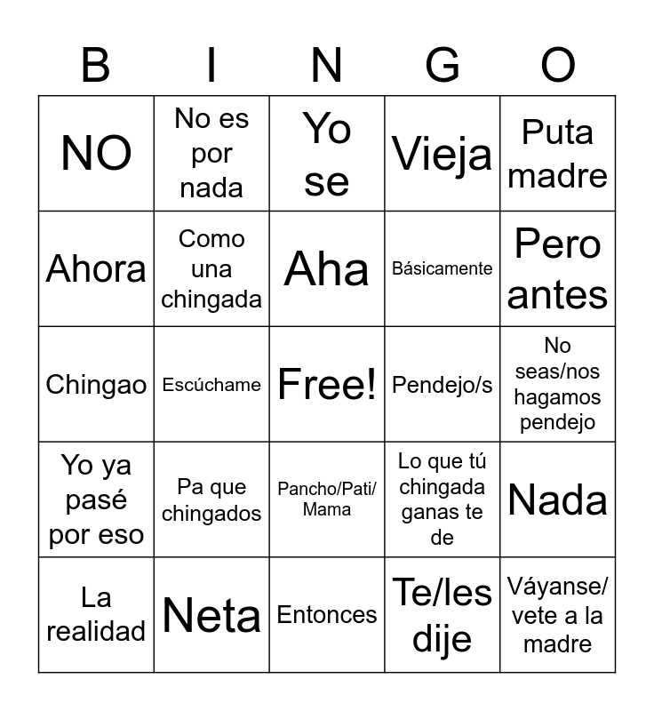 This bingo card has a free space and 30 words: Neta, Me vale madre, Escúchame, Espérate, NO, Yo se, Como una chingada, Pancho/Pati/ Mama, Pendejo/s, Entonces, No seas/nos hagamos pendejo, Váyanse/ vete a la madre, Te/les dije, Mira, Pero antes, Okay, Lo que tú chingada ganas te de, Yo ya pasé por eso, Pa que chingados, Puta madre, Chingao, Pinche, No es por nada, Básicamente, Ahora, Vieja, Nada, La realidad, Aha and Claro.