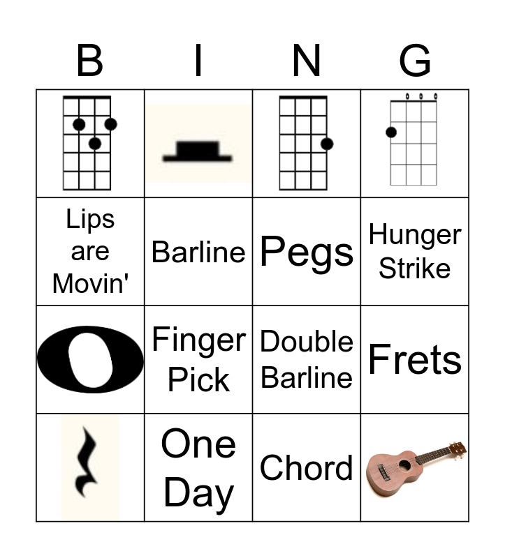 This bingo card has 10 images and 14 words: Strum, Shake it Off, Hunger Strike, Stronger, Lips are Movin', Barline, One Day, Respect, Double Barline, Pegs, String, Chord, Finger Pick and Frets.
