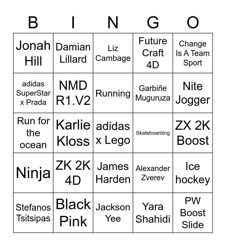 This bingo card has 25 words: ZK 2K 4D, Jackson Yee, Running, Stefanos Tsitsipas, Change Is A Team Sport, Jonah Hill, adidas SuperStar x Prada, Damian Lillard, Skateboarding, James Harden, Garbiñe Muguruza, Run for the ocean, Alexander Zverev, Ice hockey, NMD R1.V2, PW Boost Slide, ZX 2K Boost, Liz Cambage, Nite Jogger, Karlie Kloss, adidas x Lego, Black Pink, Ninja, Future Craft 4D and Yara Shahidi.