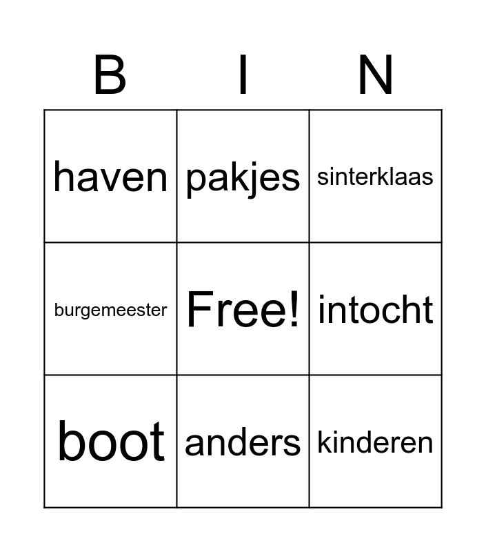 This bingo card has a free space and 8 words: intocht, sinterklaas, pakjes, boot, haven, kinderen, burgemeester and anders.
