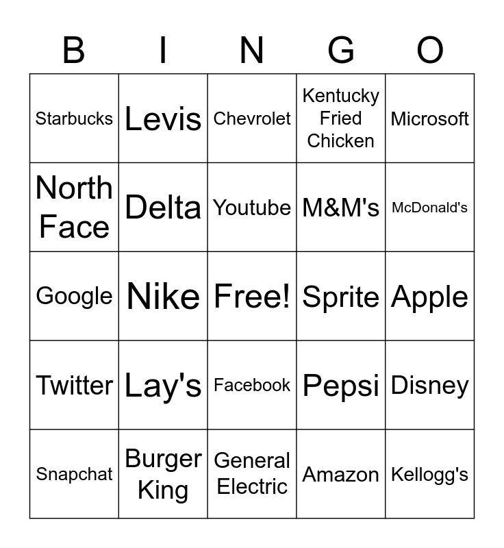 This bingo card has a free space and 24 words: Lay's, Burger King, Youtube, Snapchat, Microsoft, Starbucks, North Face, Levis, Sprite, Facebook, M&M's, Google, Pepsi, Disney, Delta, Amazon, Apple, Chevrolet, McDonald's, Nike, Kellogg's, Twitter, Kentucky Fried Chicken and General Electric.