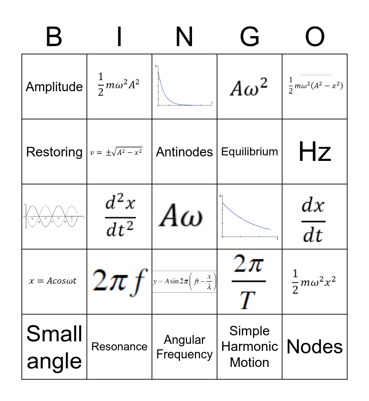 This bingo card has 19 images and 13 words: Simple Harmonic Motion, k, Nodes, Antinodes, Small angle, Standing wave, Resonance, Equilibrium, Restoring, Amplitude, Angular Frequency, Period and Hz.