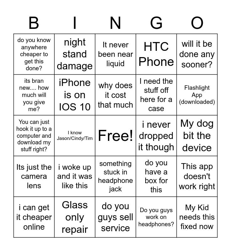 This bingo card has a free space and 25 words: i woke up and it was like this, do you guys sell service, why does it cost that much, i can get it cheaper online, will it be done any sooner?, do you know anywhere cheaper to get this done?, its bran new.... how much will you give me?, night stand damage, i never dropped it though, something stuck in headphone jack, I need the stuff off here for a case, You can just hook it up to a computer and download my stuff right?, do you have a box for this, This app doesn't work right, iPhone is on IOS 10, Battery health 55% or below, My dog bit the device, It never been near liquid, Flashlight App (downloaded), I know Jason/Cindy/Tim, My Kid needs this fixed now, Glass only repair, Its just the camera lens, HTC Phone and Do you guys work on headphones?.