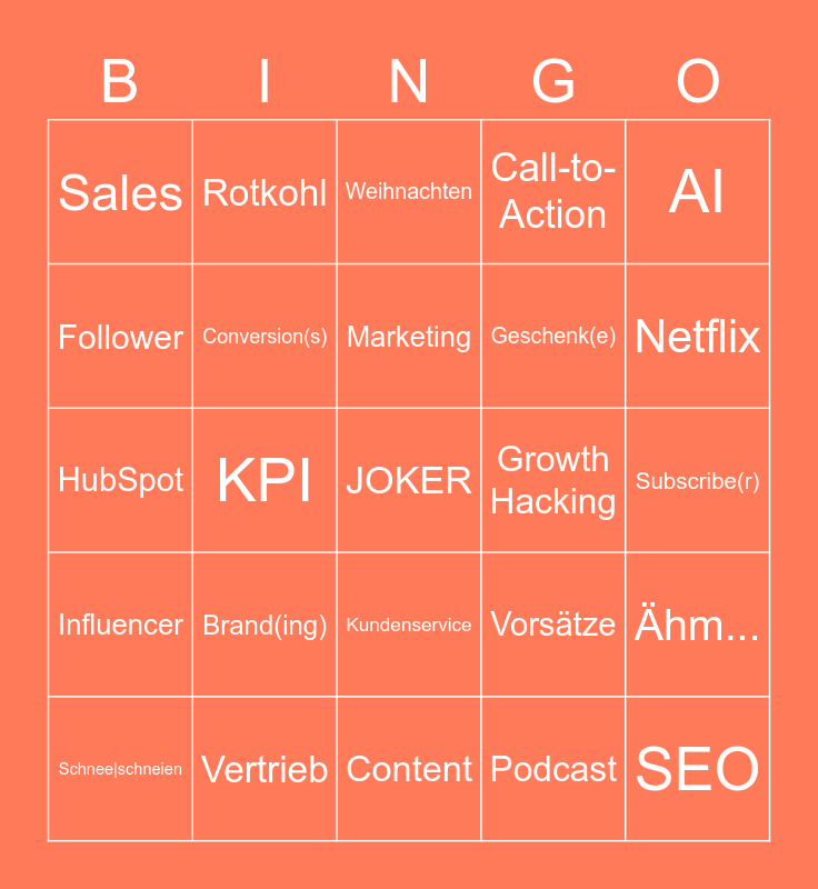 This bingo card has a free space and 40 words: Digital Helpdesk, HubSpot, Leads, Conversion(s), Vertrieb, Kundenservice, Marketing, CRM, AI, Influencer, KPI, Call-to-Action, SEO, Subscribe(r), Growth Hacking, Brand(ing), Deal(s), Sales, Personalisierung, Weihnachten, Ähm..., Podcast, Geschenk(e), Follower, 2021, LinkedIn, Instagram, Facebook, Corona, Glühwein, Wichteln, Schnee|schneien, Homeoffice, Vorsätze, Netflix, Content, Social Media, TikTok, Rotkohl and Tool(s).
