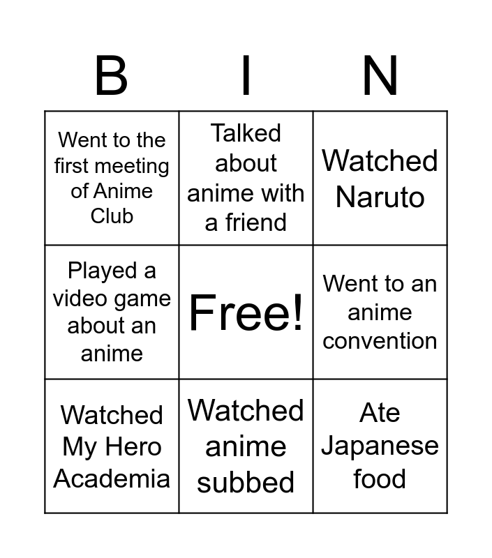 This bingo card has a free space and 9 words: Watched My Hero Academia, Watched Naruto, Talked about anime with a friend, Played a video game about an anime, Went to the first meeting of Anime Club, Went to an anime convention, Ate Japanese food, Watched anime dubbed and Watched anime subbed.