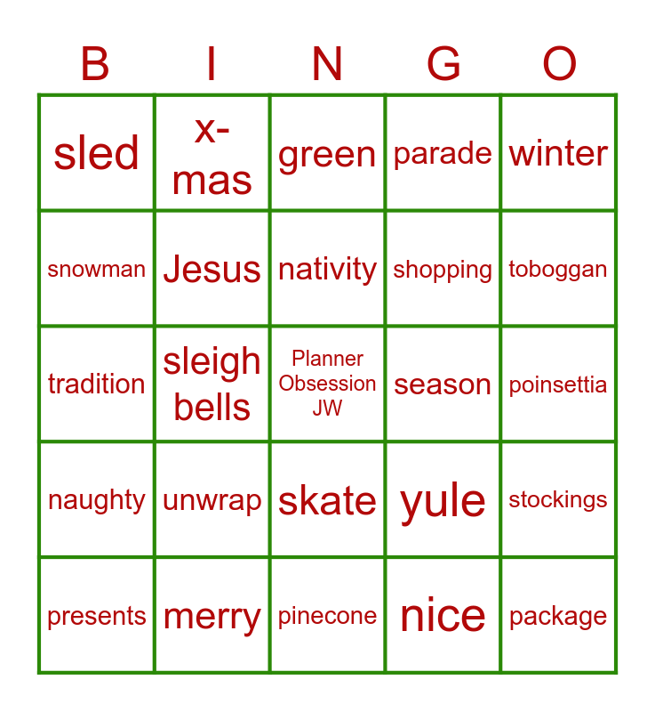 This bingo card has a free space and 24 words: unwrap, merry, nativity, presents, winter, sled, snowman, x-mas, season, skate, shopping, tradition, yule, stockings, Jesus, nice, poinsettia, green, toboggan, sleigh bells, package, naughty, parade and pinecone.