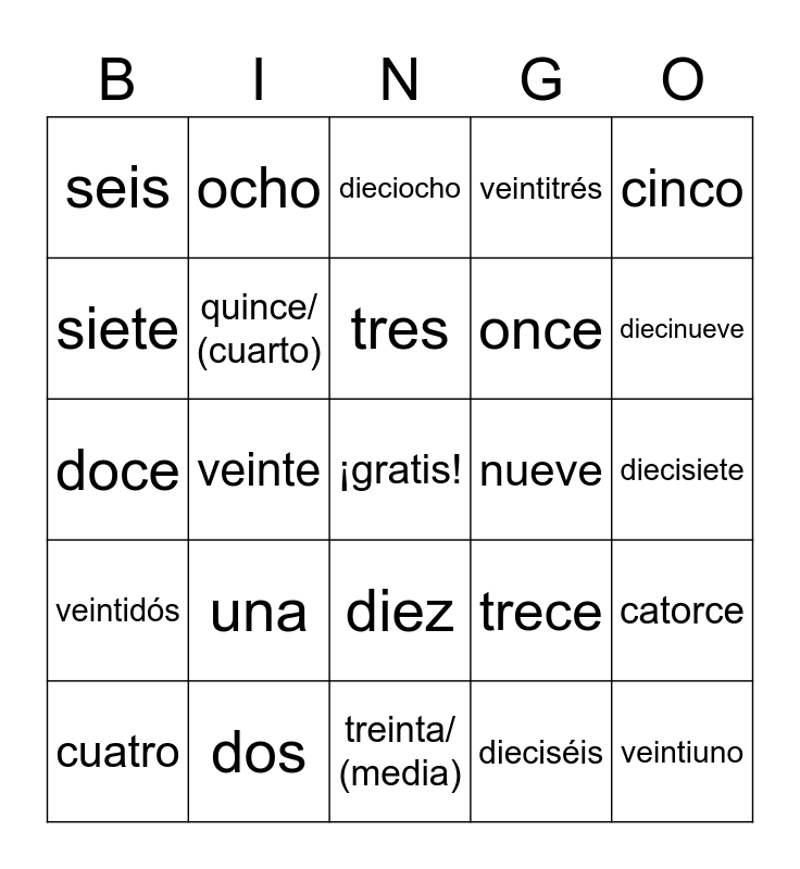 This bingo card has a free space and 24 words: una, dos, tres, cuatro, cinco, seis, siete, ocho, nueve, diez, once, doce, trece, catorce, quince/ (cuarto), dieciséis, diecisiete, dieciocho, diecinueve, veinte, veintiuno, veintidós, veintitrés and treinta/ (media).