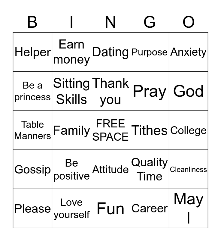 This bingo card has a free space and 24 words: Be positive, Love yourself, Thank you, Please, Anxiety, Helper, Be a princess, Earn money, Tithes, Attitude, Pray, Table Manners, Quality Time, Cleanliness, Sitting Skills, Career, College, Dating, God, Family, May I, Gossip, Purpose and Fun.