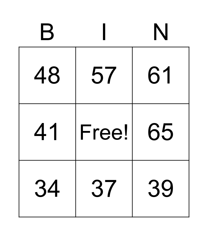 This bingo card has a free space and 39 words: 31, 32, 33, 34, 35, 36, 37, 38, 39, 40, 42, 41, 43, 44, 45, 46, 47, 48, 50, 60, 65, 55, 68, 56, 49, 51, 52, 53, 54, 57, 58, 59, 61, 62, 63, 64, 66, 67 and 69.