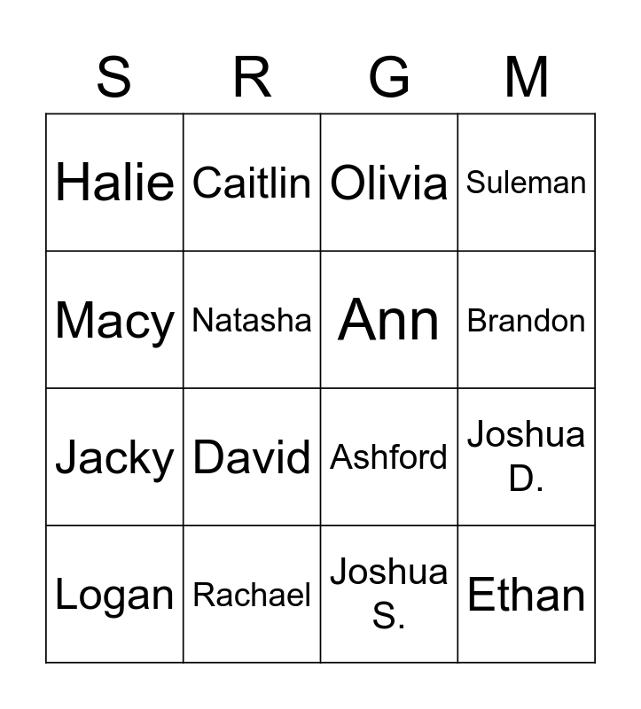 This bingo card has 16 words: Rachael, Joshua D., Olivia, Halie, Jacky, Caitlin, Ashford, Joshua S., Macy, Natasha, Logan, Suleman, David, Brandon, Ann and Ethan.