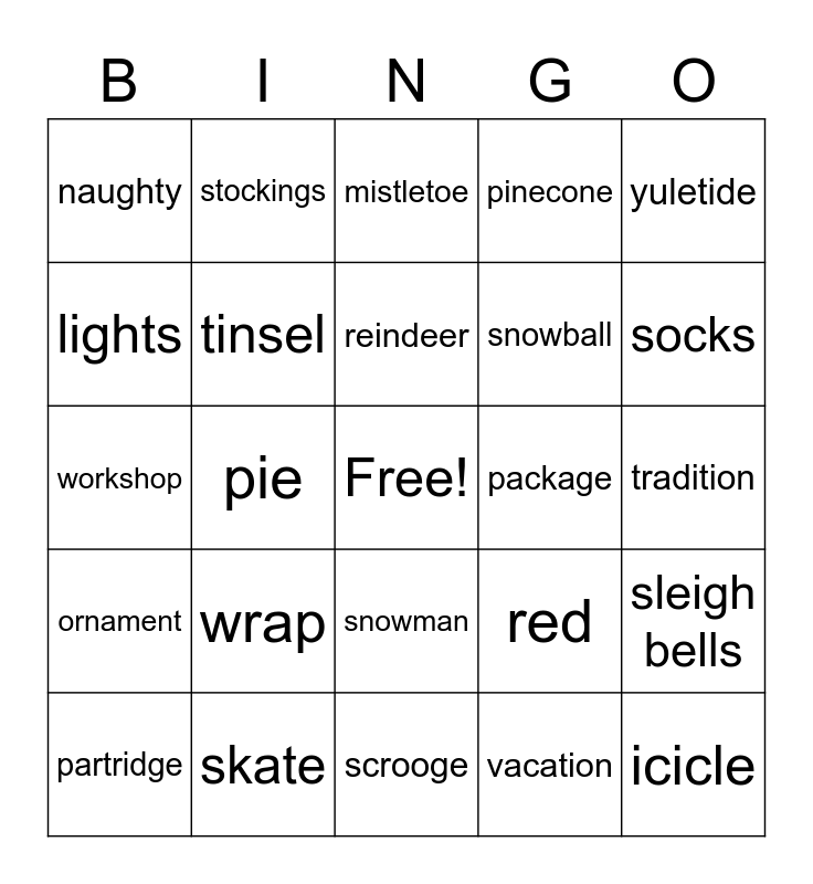 This bingo card has a free space and 48 words: yule, icicle, holly, scrooge, wrap, santa, stockings, toboggan, lights, joy, tinsel, pinecone, sleigh bells, red, sugar plum, snow flake, reindeer, package, nice, yuletide, pie, vacation, naughty, snowball, unwrap, socks, partridge, ribbon, snowman, ornament, wish, xmas, toys, ham, skate, presents, party, tradition, nice, sweater, sled, shopping, mistletoe, snow, workshop, pointsetta, noel and green.