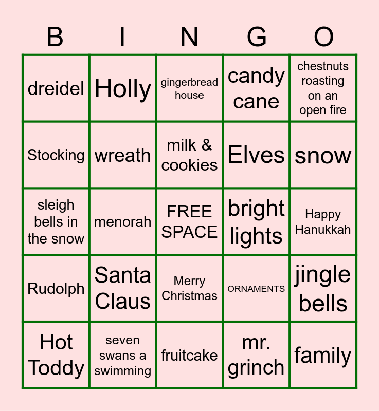 This bingo card has a free space and 24 words: Santa Claus, seven swans a swimming, milk & cookies, Hot Toddy, chestnuts roasting on an open fire, dreidel, Stocking, Holly, bright lights, Merry Christmas, Elves, sleigh bells in the snow, ORNAMENTS, jingle bells, wreath, mr. grinch, Happy Hanukkah, gingerbread house, snow, menorah, family, Rudolph, candy cane and fruitcake.