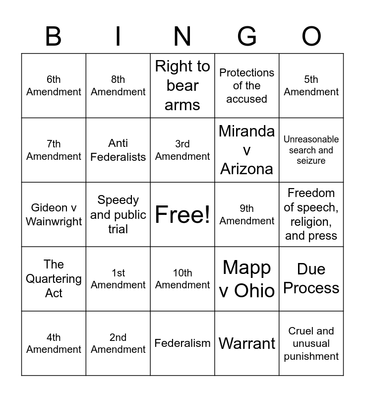 This bingo card has a free space and 24 words: 1st Amendment, 2nd Amendment, 3rd Amendment, 4th Amendment, 5th Amendment, 6th Amendment, 7th Amendment, 8th Amendment, 9th Amendment, 10th Amendment, Miranda v Arizona, Gideon v Wainwright, Mapp v Ohio, Due Process, Anti Federalists, Warrant, Freedom of speech, religion, and press, Right to bear arms, Unreasonable search and seizure, Speedy and public trial, Cruel and unusual punishment, The Quartering Act, Protections of the accused and Federalism.
