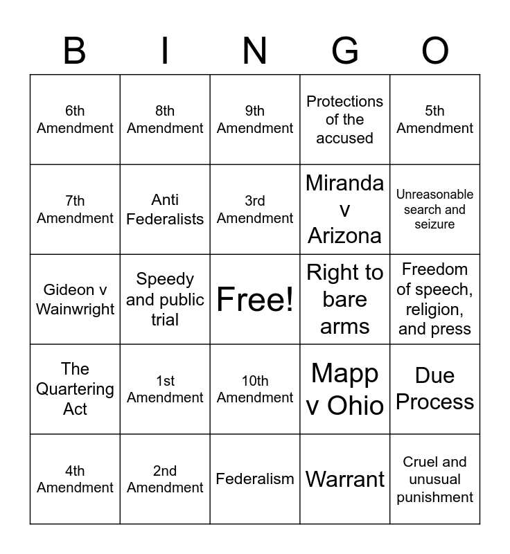 This bingo card has a free space and 24 words: 1st Amendment, 2nd Amendment, 3rd Amendment, 4th Amendment, 5th Amendment, 6th Amendment, 7th Amendment, 8th Amendment, Right to bare arms, 10th Amendment, Miranda v Arizona, Gideon v Wainwright, Mapp v Ohio, Due Process, Anti Federalists, Warrant, Freedom of speech, religion, and press, 9th Amendment, Unreasonable search and seizure, Speedy and public trial, Cruel and unusual punishment, The Quartering Act, Protections of the accused and Federalism.