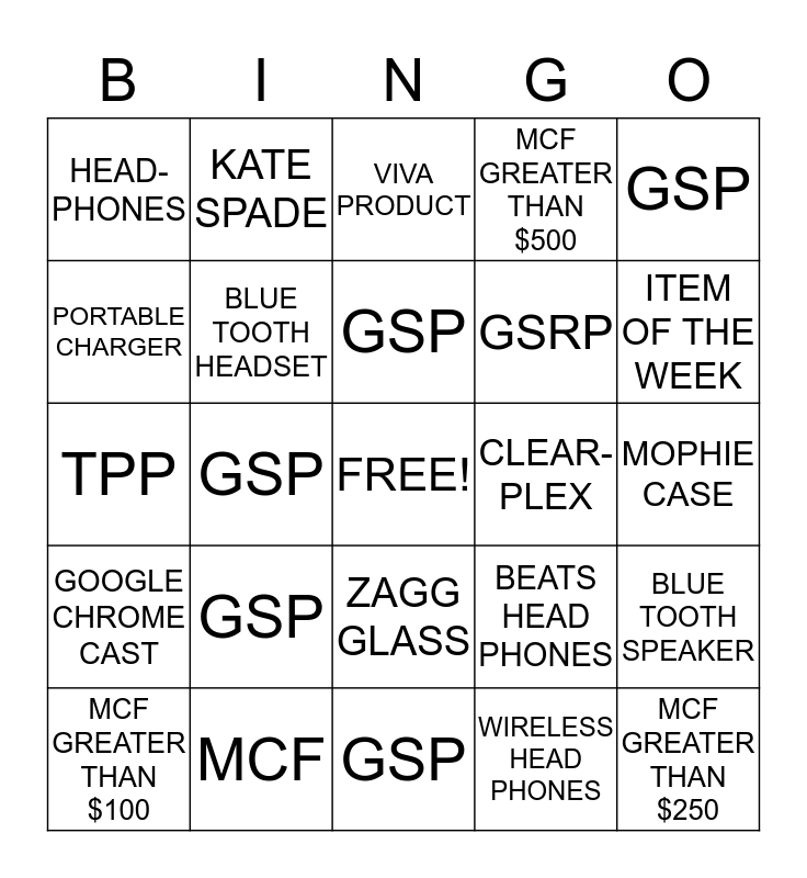 This bingo card has a free space and 24 words: GSP, MCF, GSP, MCF GREATER THAN $100, GSP, HEAD-PHONES, PORTABLE CHARGER, KATE SPADE, CLEAR-PLEX, ZAGG GLASS, GSRP, TPP, BEATS HEAD PHONES, BLUE TOOTH SPEAKER, BLUE TOOTH HEADSET, WIRELESS HEAD PHONES, MOPHIE CASE, VIVA PRODUCT, ITEM OF THE WEEK, GSP, MCF GREATER THAN $250, GOOGLE CHROME CAST, MCF GREATER THAN $500 and GSP.