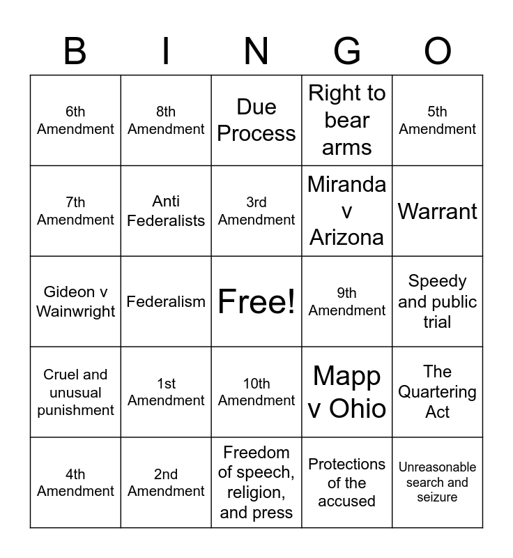 This bingo card has a free space and 24 words: 1st Amendment, 2nd Amendment, 3rd Amendment, 4th Amendment, 5th Amendment, 6th Amendment, 7th Amendment, 8th Amendment, 9th Amendment, 10th Amendment, Miranda v Arizona, Gideon v Wainwright, Mapp v Ohio, The Quartering Act, Anti Federalists, Protections of the accused, Speedy and public trial, Due Process, Warrant, Federalism, Unreasonable search and seizure, Cruel and unusual punishment, Right to bear arms and Freedom of speech, religion, and press.