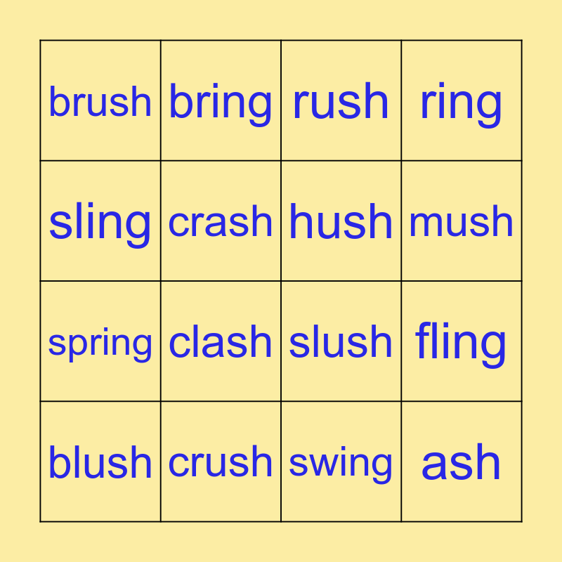 This bingo card has 24 words: flash, cling, mush, trash, sling, brush, crash, bring, crush, stash, spring, slush, dash, string, hush, bash, swing, rush, clash, fling, blush, ash, ring and gush.
