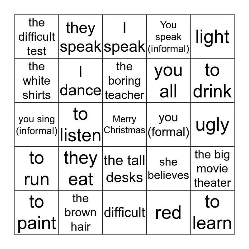 This bingo card has a free space and 24 words: they eat, the brown hair, the boring teacher, to paint, light, the difficult test, the white shirts, they speak, you (formal), the tall desks, you all, you sing (informal), she believes, the big movie theater, I dance, red, ugly, I speak, to drink, to listen, to learn, to run, You speak (informal) and difficult.