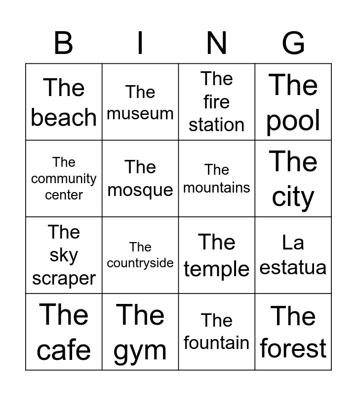 This bingo card has 20 words: La estatua, The police station, The fire station, The gas station, The cafe, The community center, The gym, The beach, The sky scraper, The museum, The countryside, The temple, The mosque, The forest, The mountains, The suburbs, The city, The pool, The fountain and The plaza.