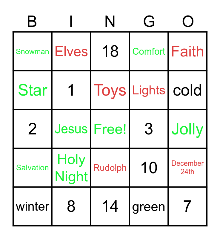 This bingo card has a free space and 64 words: Secret Santa, Merry, Joy, December 24th, Christmas, Gift, Elves, Family, Toys, Jingle Bells, Rudolph, Mistletoe, Jolly, Faith, Candy Cane, Star, Jesus, Snowman, Santa, Lights, Holy Night, Salvation, Comfort, Love, Snow, snowball fight, Peaceful, Caroling, Eggnog, Holiday, Gingerbread house, Reindeer, Peace, ECI, cold, winter, cross, green, red, 1, 2, 3, 4, 5, 6, 7, 8, 9, 10, 11, 12, 13, 14, 15, 16, 17, 18, 19, 20, 21, 22, 23, 24 and 25.