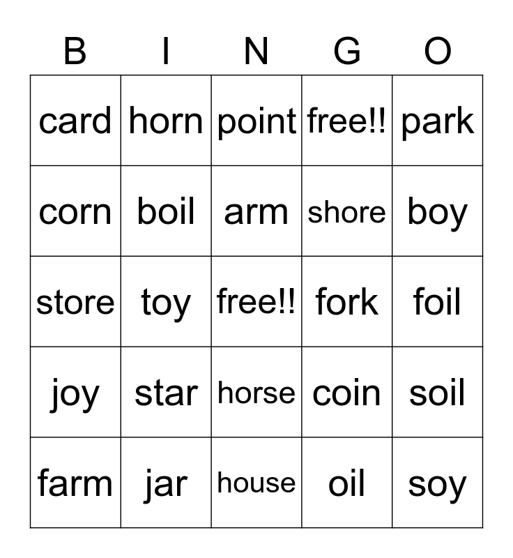 This bingo card has a free space and 24 words: star, jar, arm, farm, park, card, corn, horn, fork, horse, shore, store, coin, soil, boil, oil, foil, point, boy, toy, soy, joy, free!! and house.