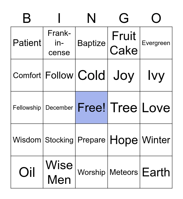 This bingo card has a free space and 75 words: Advent, Amaryllis, Baptize, Bells, Birth, Boxing Day, Candles, Candy, Carols, Chocolate, Christmas, Cider, Cold, Comfort, Cookies, December, Deliver, Earth, Egg Nog, Evergreen, Faith, Fellowship, Follow, Frank-in-cense, Fruit Cake, Gifts, Gingerbread, Giving, Glory, Gold, Hanukkah, Holly, Holy, Hope, Ivy, Joy, King, Kwanzaa, Love, Meteors, Mistletoe, Myrrh, Mystery, Narcissus, Nativity, Nobel, Oil, Patient, Peace, Pearl Harbor, Poinsettia, Prepare, Pudding, Reindeer, Rejoice, Rest, Saint Nicholas, Sleigh, Solstice, Star, Stocking, Strengthen, Sweater, Ten, Tender, Tree, Twelve, Wait, Wassail, Winter, Wisdom, Wise Men, Word, Worship and Wreath.