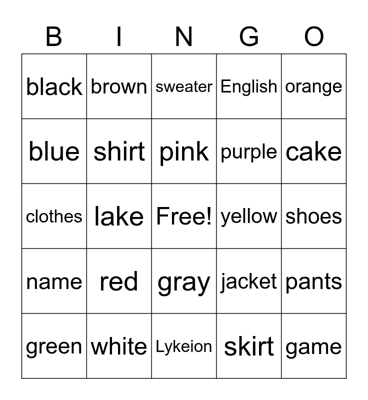 This bingo card has a free space and 24 words: red, white, pink, green, orange, black, blue, brown, yellow, gray, purple, clothes, jacket, pants, shirt, skirt, shoes, sweater, cake, lake, game, name, English and Lykeion.