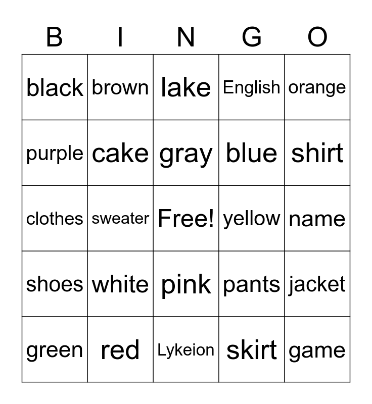 This bingo card has a free space and 24 words: white, red, gray, green, orange, black, purple, brown, yellow, pink, blue, clothes, pants, jacket, cake, skirt, name, lake, shirt, sweater, game, shoes, English and Lykeion.