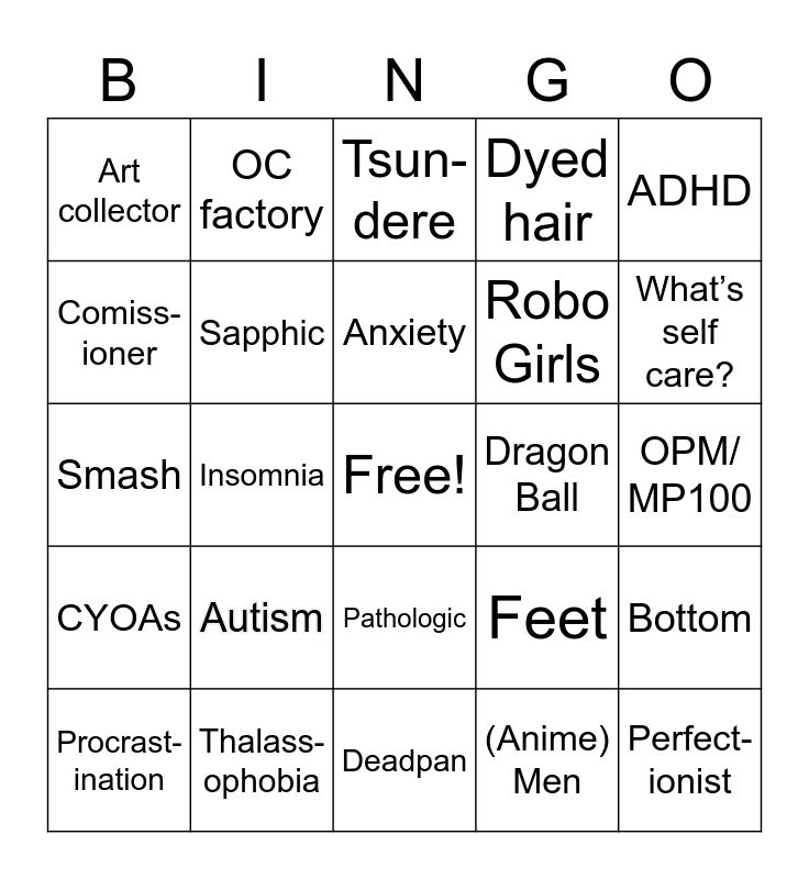 This bingo card has a free space and 24 words: Autism, Thalass- ophobia, Anxiety, Procrast- ination, ADHD, Art collector, Comiss-ioner, OC factory, Dragon Ball, Pathologic, Robo Girls, Smash, Feet, Bottom, Sapphic, (Anime) Men, OPM/ MP100, Tsun- dere, What’s self care?, Insomnia, Perfect- ionist, CYOAs, Dyed hair and Deadpan.