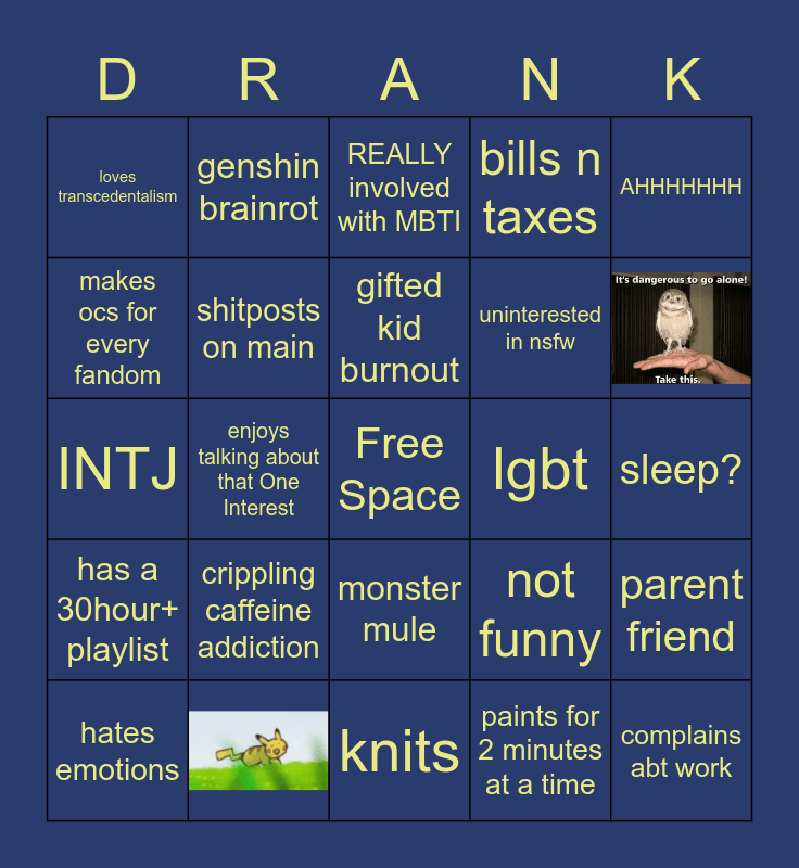 This bingo card has 2 images, a free space and 22 words: crippling caffeine addiction, gifted kid burnout, hates emotions, AHHHHHHH, loves transcedentalism, makes ocs for every fandom, genshin brainrot, lgbt, monster mule, uninterested in nsfw, INTJ, not funny, parent friend, shitposts on main, paints for 2 minutes at a time, sleep?, REALLY involved with MBTI, enjoys talking about that One Interest, complains abt work, has a 30hour+ playlist, bills n taxes and knits.