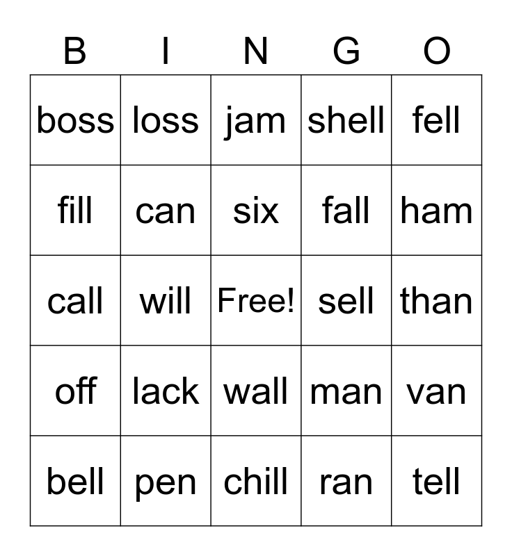 This bingo card has a free space and 24 words: lack, pen, six, bell, fell, boss, fill, loss, sell, wall, fall, call, man, van, can, ran, than, jam, ham, will, tell, off, shell and chill.